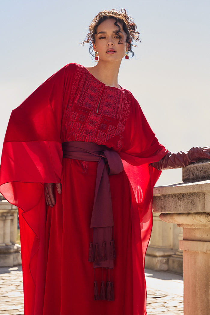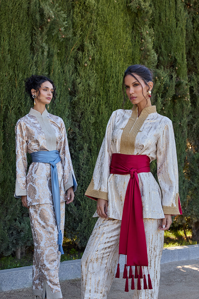 As the sun sets and night deepens, Ramadan draws near with its serene spirituality. She adorns herself for its gatherings with opulent kaftans adorned with intricate embroidery and brocade fabrics alive with texture and light, like silent poems shared among family in settings glowing with warmth and affection.